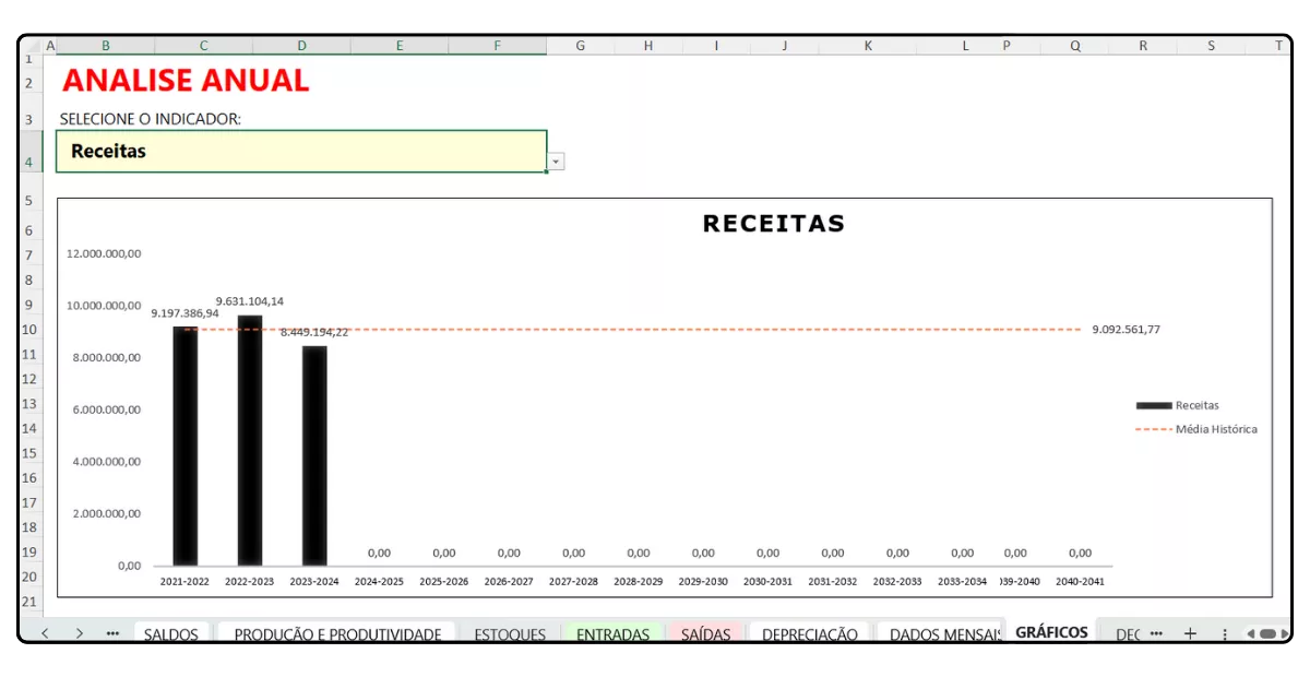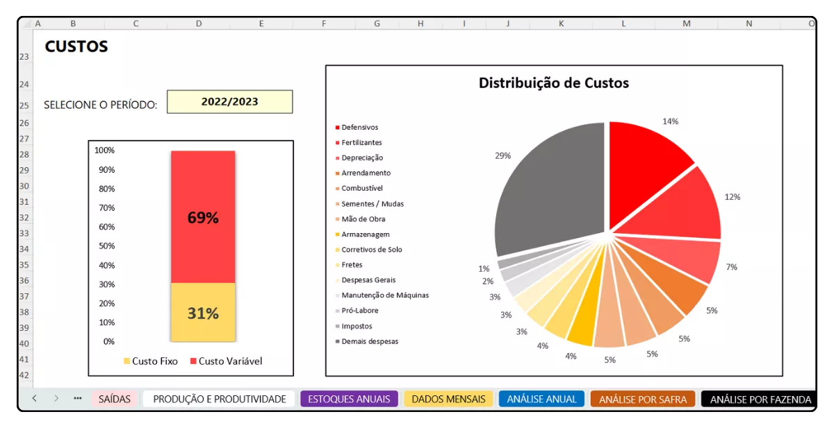 A planilha tem uma seção exclusiva para análise de desempenho anual da fazenda.